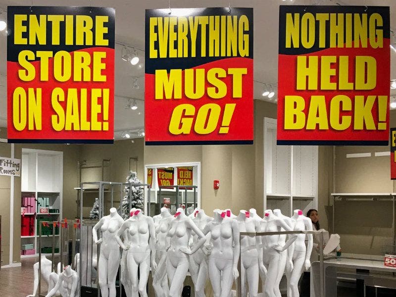 Most locations have dumped their merchandise and are down to mannequins, shelves and tables.