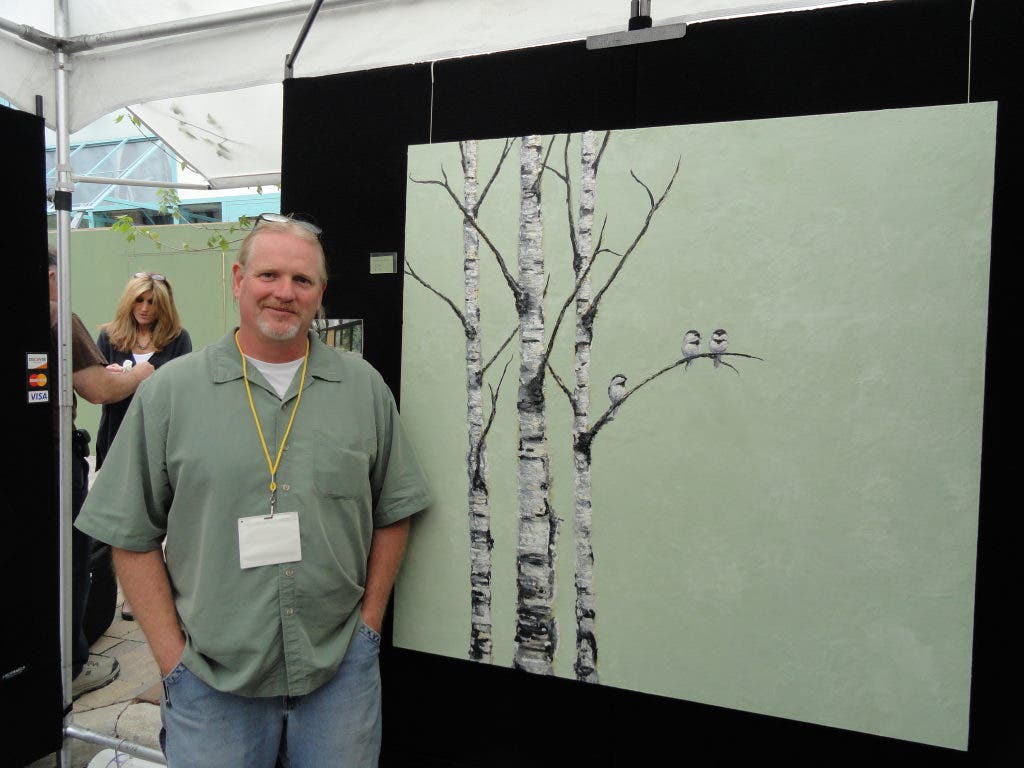 At his home studio in Westlake, Paul Fletcher is using one of the oldest art forms in the world to create uniquely textured paintings. Fletcher said he specializes in landscape and wildlife, and at the , he was showing pieces with richly textured birch trees, rolling green hills dotted with sheep and subtle colors.
