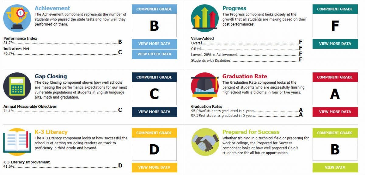 The Ohio Department of Education grades districts on six categories: Achievement, Progress, Gap Closing, Graduation Rate, Prepared for Success, and K-3 Literacy.
