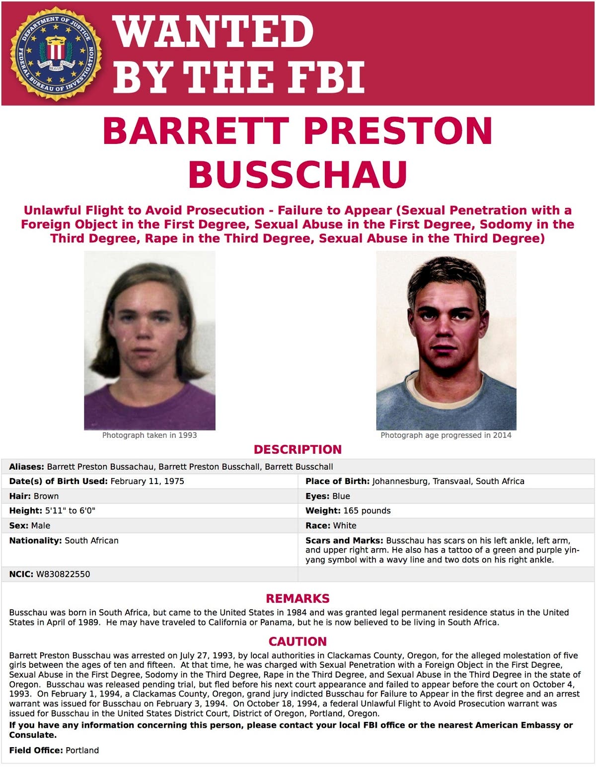FBI investigators believe Barrett Busschau fled to California and/or Panama when he ran from authorities in 1993. He is 42 years old now.