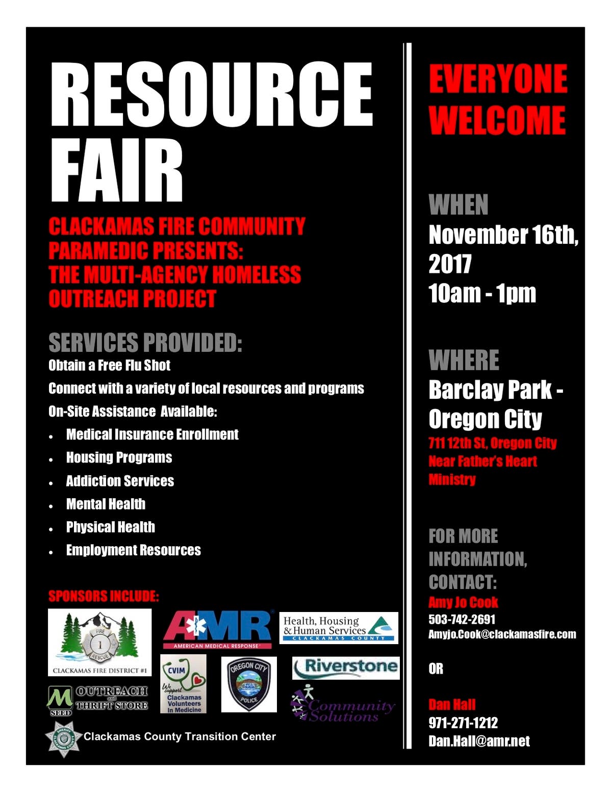 On Thursday, Nov. 16, Cook and Clackamas Fire District #1 will host the inaugural Resource Fair at Barclay Park, 711 12th St. in Oregon City, from 10 a.m. to 1 p.m. The fair, according to fire district spokesman Steve Hoffeditz, is "designed to bring community resources to citizens who need them most within Clackamas County."
