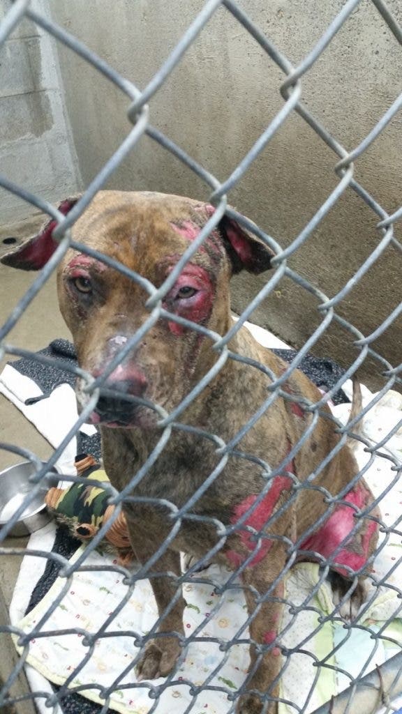 Amber the 60-pound Pit Bull mix was badly burned in April by her previous owner. Following her recovery, she's in search of a new home.