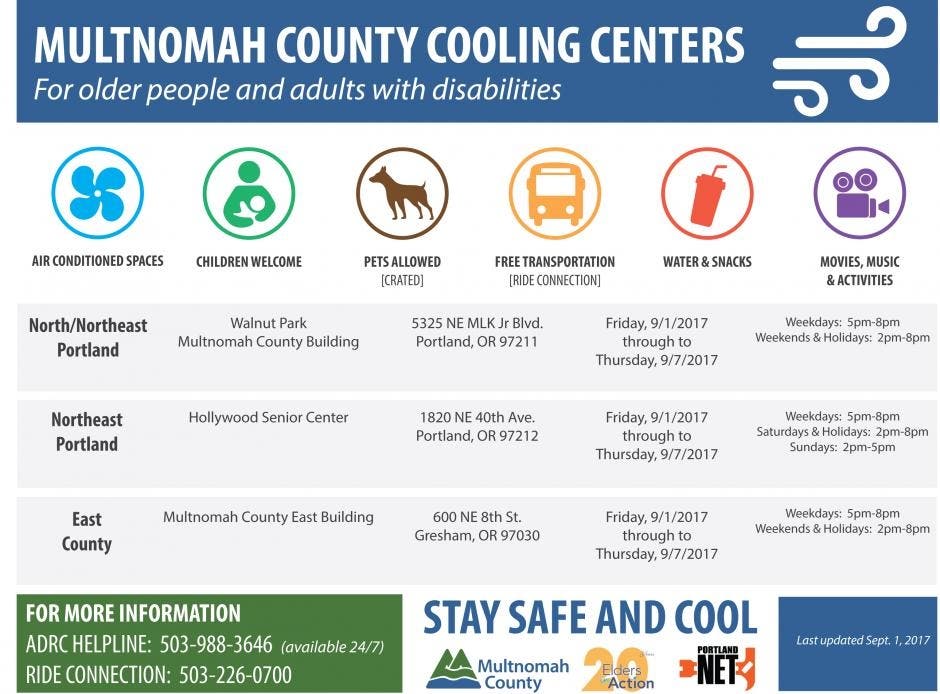 In response to forecasts calling for extreme heat and poor air quality across the Portland metro region throughout Labor Day weekend and possibly into mid-week, Multnomah County officials will open cooling centers between Sept. 1 and Sept. 7.