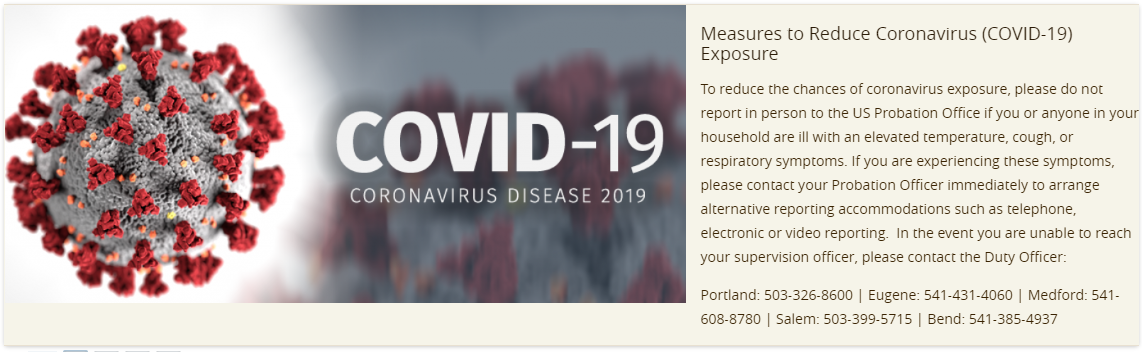 People on federal parole or supervised release in Portland, Oregon received an email alert this afternoon directing them not to report to the United States Probation Office (USPO) in downtown Portland if they are sick. That email has since been confirmed by the an announcement posted on the USPO website for the District or Oregon.