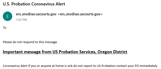 The United States Probation Office (USPO) in Portland, Oregon issued an email alert directing offenders not to report if sick.