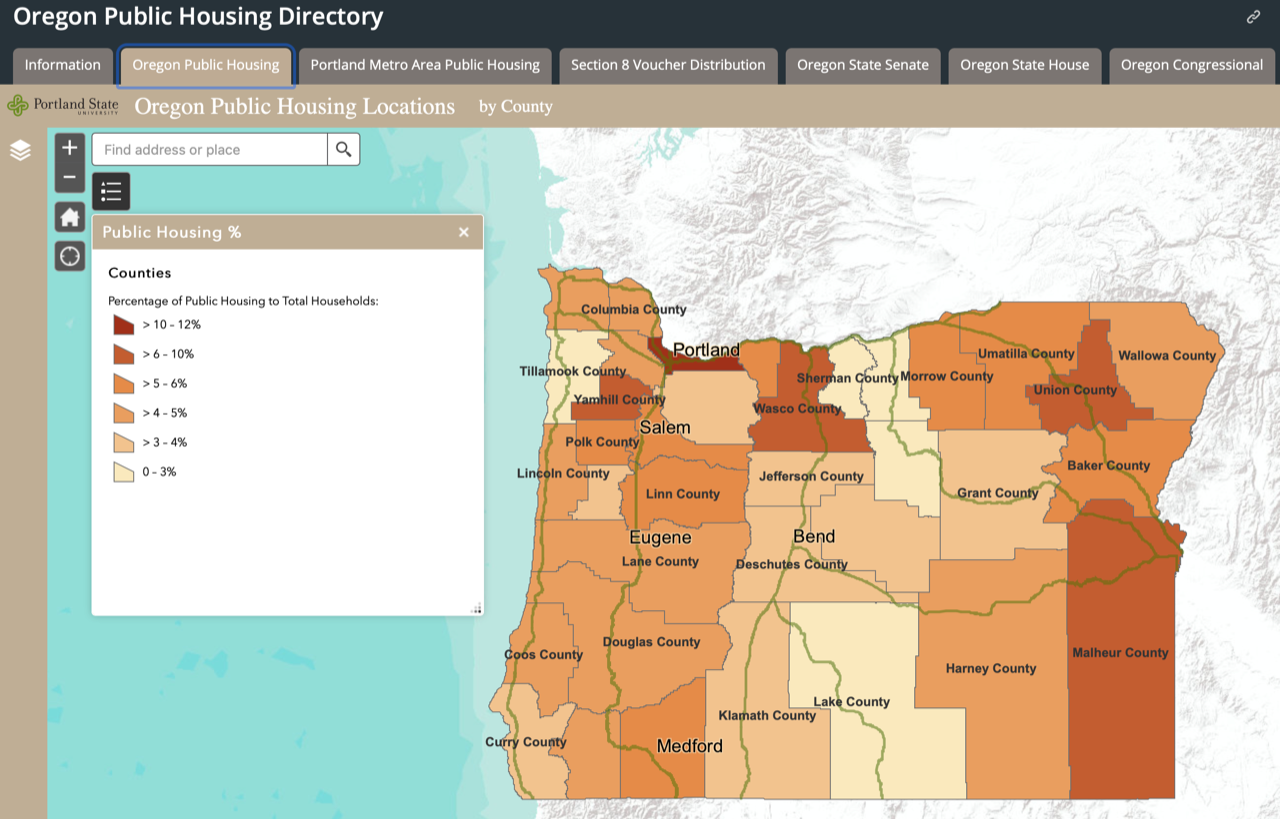 The Metro/Oregon Public Housing Location Maps, created and currently lodged at Portland State University, provide decision makers and citizens alike with an interactive tool that identifies the location and numbers of Public Housing units throughout the state of Oregon. No public decision nor conversation about the placement of Public Housing, which includes the homeless, should commence without all parties involved considering the numbers and locations of existing Public Housing units and the effects of loading more units into those communities be they neighborhoods, counties, legislative or congressional districts.