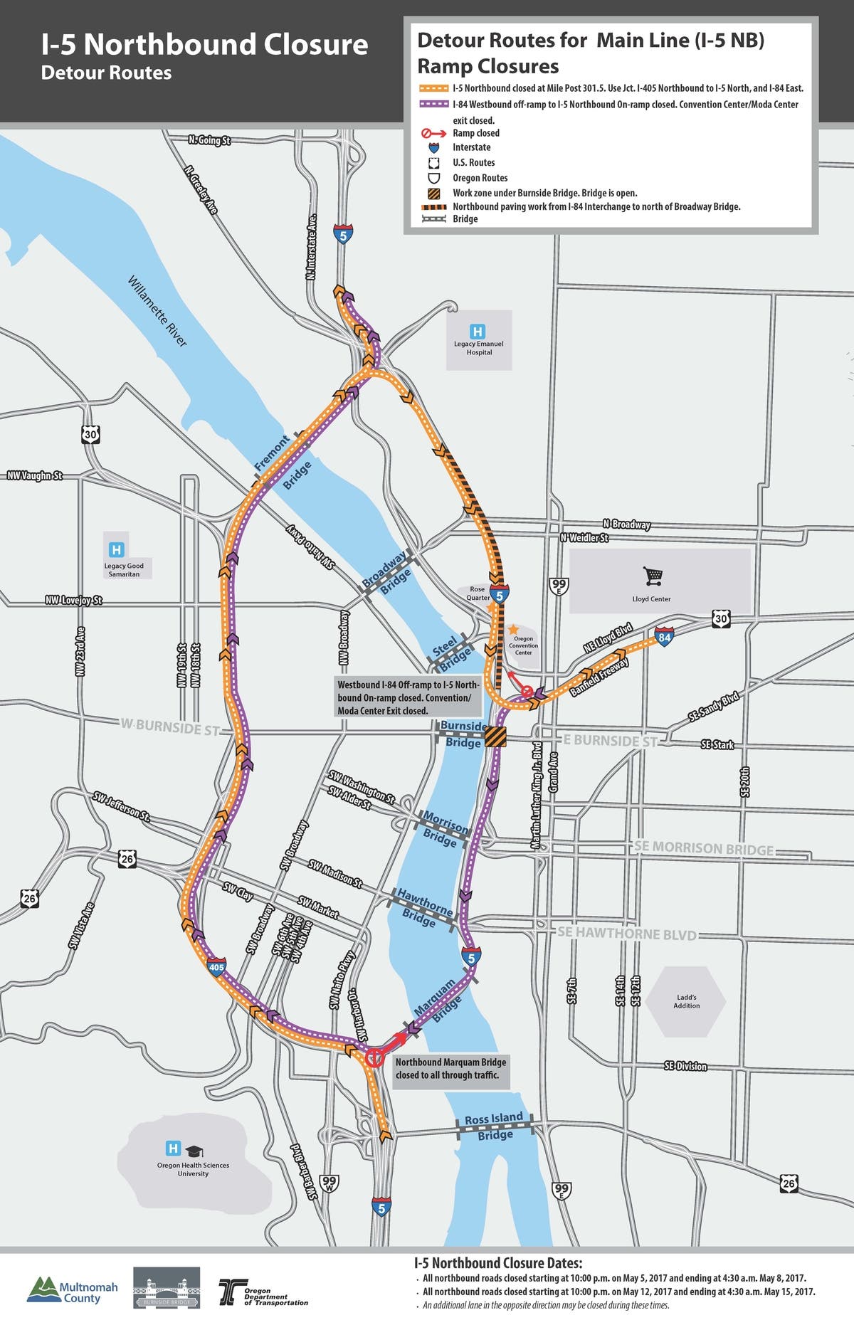 Northbound commuters on I-5 will be diverted to Interstate-405 northbound (exit 299B) at the Ross Island Bridge junction. Northbound I-5 can be resumed after crossing the Fremont Bridge.