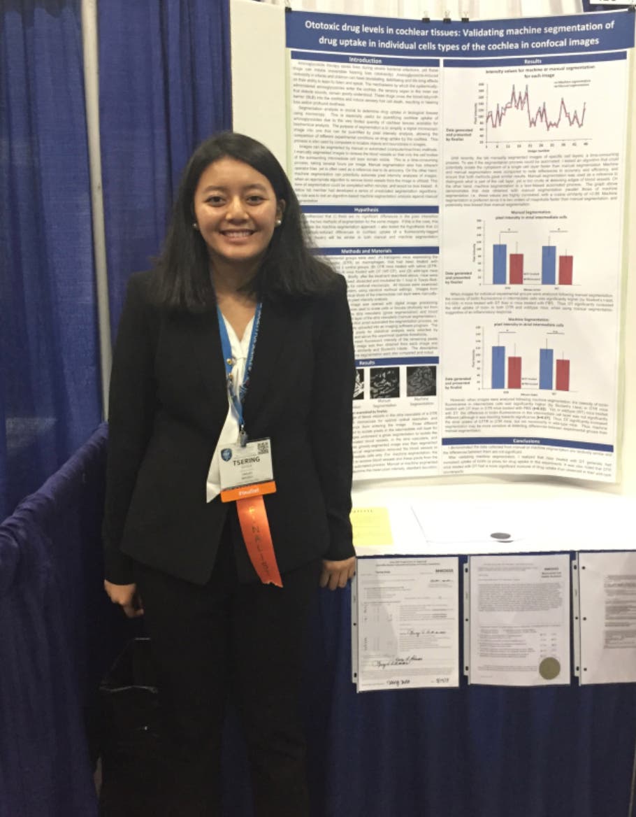 Tsering Shola, 16, earned the third place Oticon award for her work verifying the accuracy of a machine segmentation algorithm that segments images of the inner ears of mice that have been administered antibiotics called aminoglycosides.