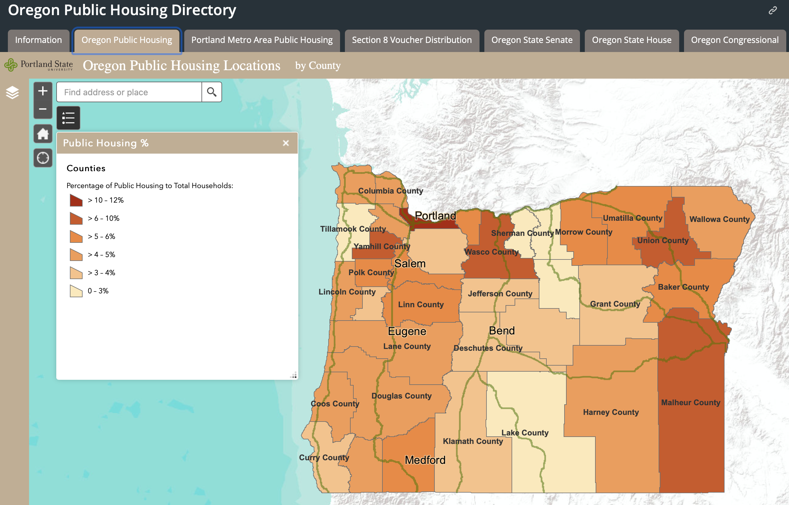 The purpose of this map is to provide a common touchstone of Public Housing Location Data. Elected officials and all Oregonians can use these maps to discuss, debate and decide on the best, reasoned, defensible, equitable policy decisions related to Public Housing locations in Oregon.