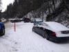 PBOT sets up chain-up areas in the shoulder heading uphill on West Burnside and SW Sam Jackson Parkway. They are set aside as a safe place for people to attach snow chains during a storm. Parking is not allowed in these areas and vehicles abandoned there are subject to towing.