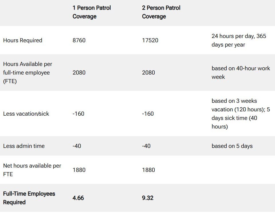 The table below displays an alternative analysis of Jenkintown’s patrol staffing requirements based on a minimum coverage model. That is, Jenkintown’s police patrol services are needed 24 hours per day, 365 days per year.