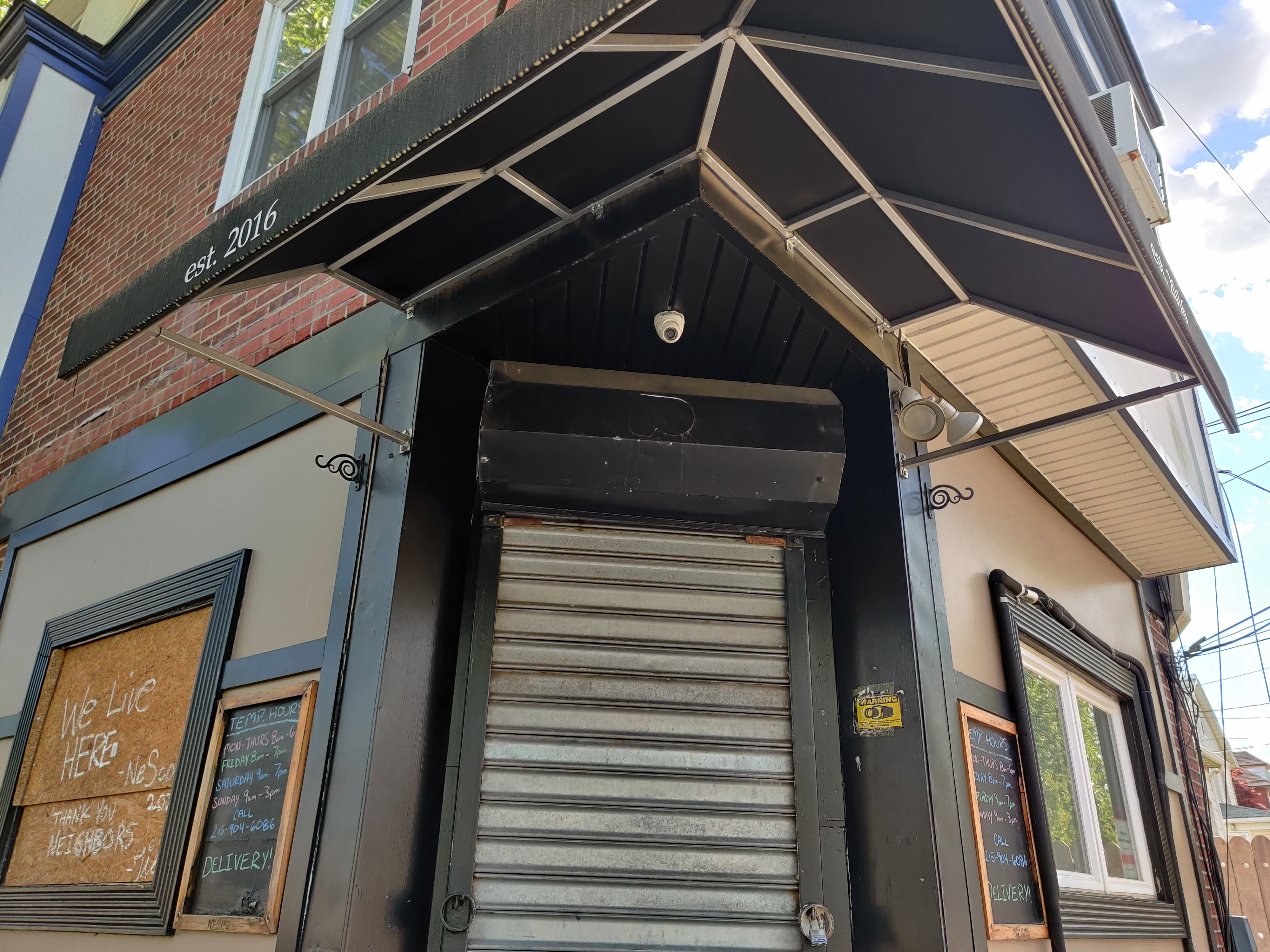 “The entire community came out here and scared them away before they could get in… climbing through the window” said a foodservice operator working at NESco, a local sandwich shop in Northeast Philadelphia. The window he’s referring to is directly in front of him, sitting on a bench by the side of the shop, it’s boarded up with plywood, and on it, a message is written “We live here” and below that, “Thank you neighbors”.