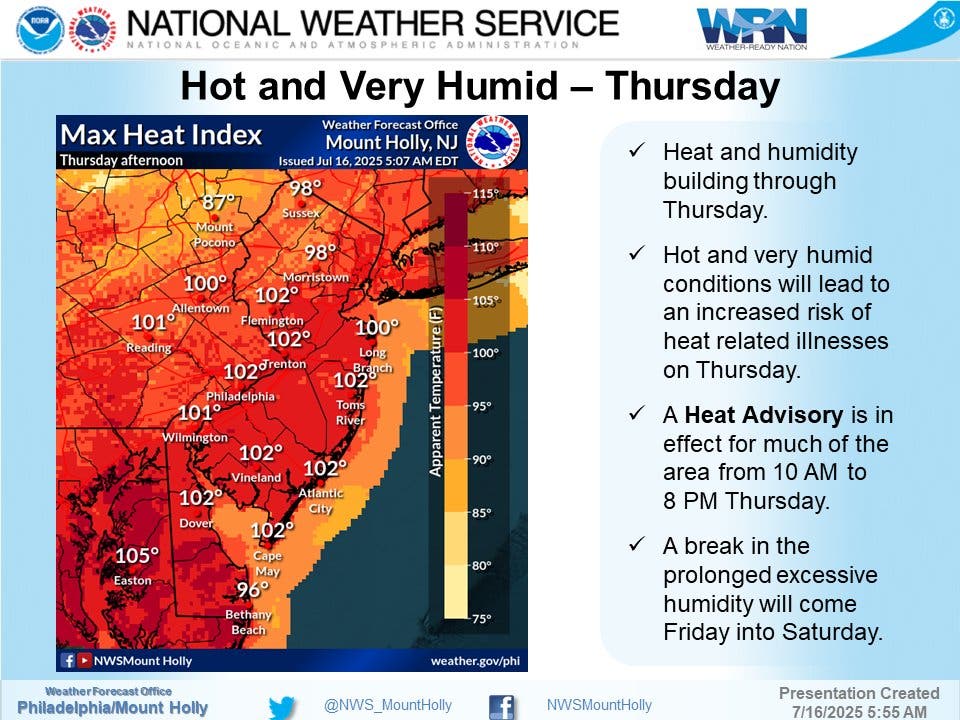 The storms will be accompanied Wednesday and into Thursday by extreme heat. The high Wednesday is 91, but it will only get worse. A heat advisory has been issued for the entire Philadelphia region for 10 a.m. to 8 p.m. Thursday, and the heat index is expected to exceed 100 throughout the area.