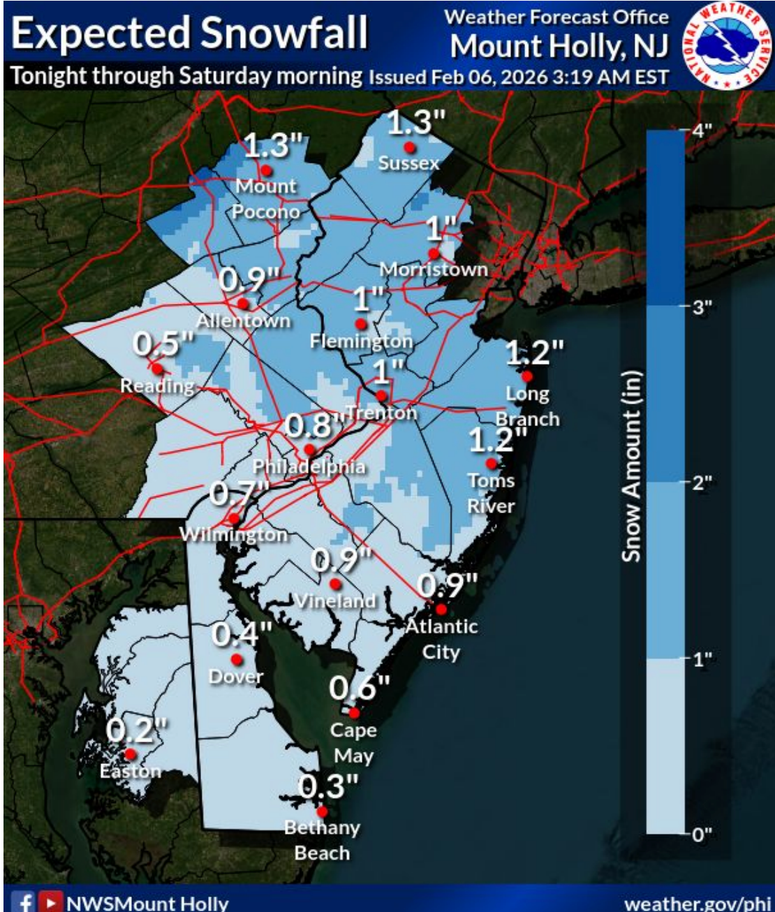Accumulation estimates are expected to be an inch or less. However, a brief period of heavier snow showers or squalls is possible early Saturday morning around dawn, forecasters said.