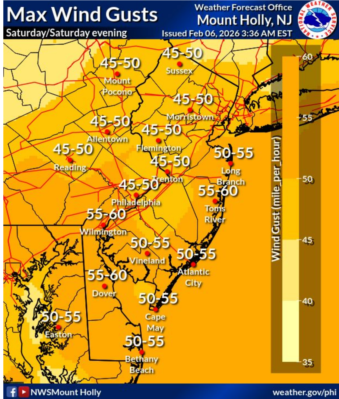 The Extreme Cold Warning is in effect for the entire area, including southeastern Pennsylvania, starting Saturday and continuing into Sunday morning at 10 a.m. A Wind Advisory will also be in place from 8 a.m. to 9 p.m. Saturday, with winds expected to increase to 20 to 35 mph. Gusts could be as high as 40 to 60 mph across the region.
