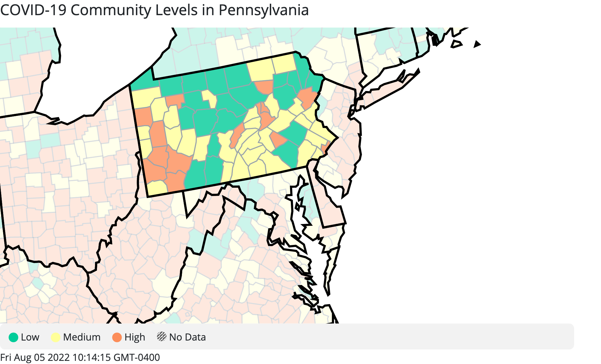 PENNSYLVANIA — A week deeper into the summer, coronavirus numbers have improved overall in Pennsylvania, according to the latest data from the CDC and the Department of Health. However, there remain a faction of counties where the virus is still at a high level of transmission, leading authorities to recommend masking there in public, indoor spaces.