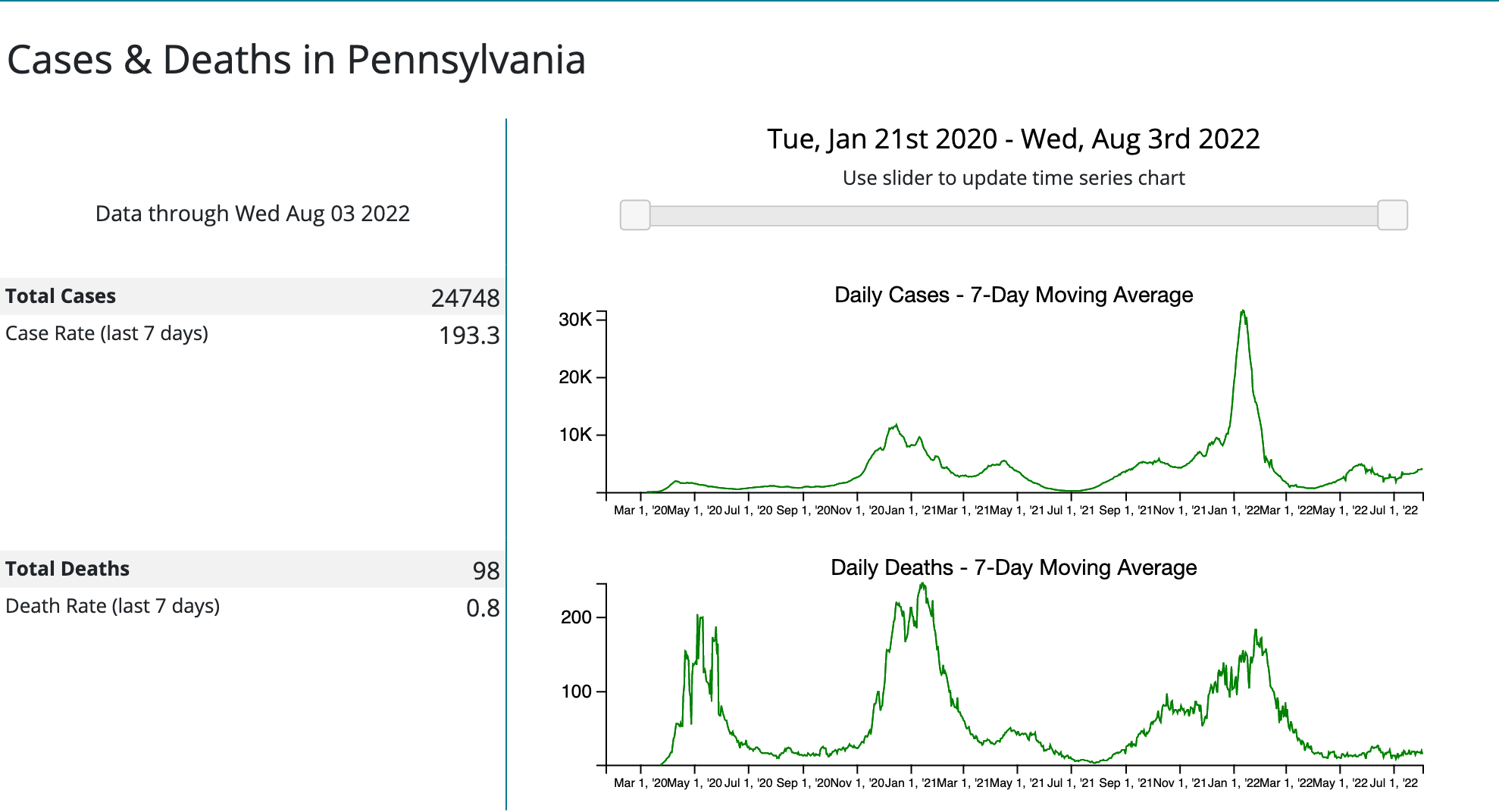 Atotal of 93 people in Pennsylvania died from the virus in the past week, according to the CDC. The state has confirmed 46,261 confirmed deaths from the virus since the pandemic began, according to the Department of Health.