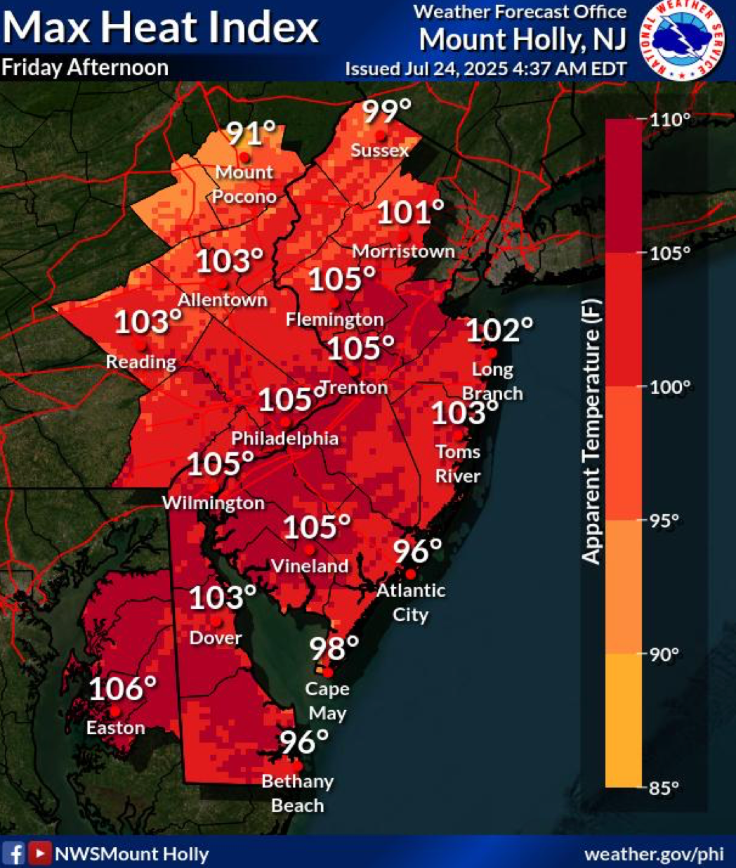 An extreme heat warning and heat advisory have been issued for all of southeastern Pennsylvania from 10 a.m. to 9 p.m. on Friday.