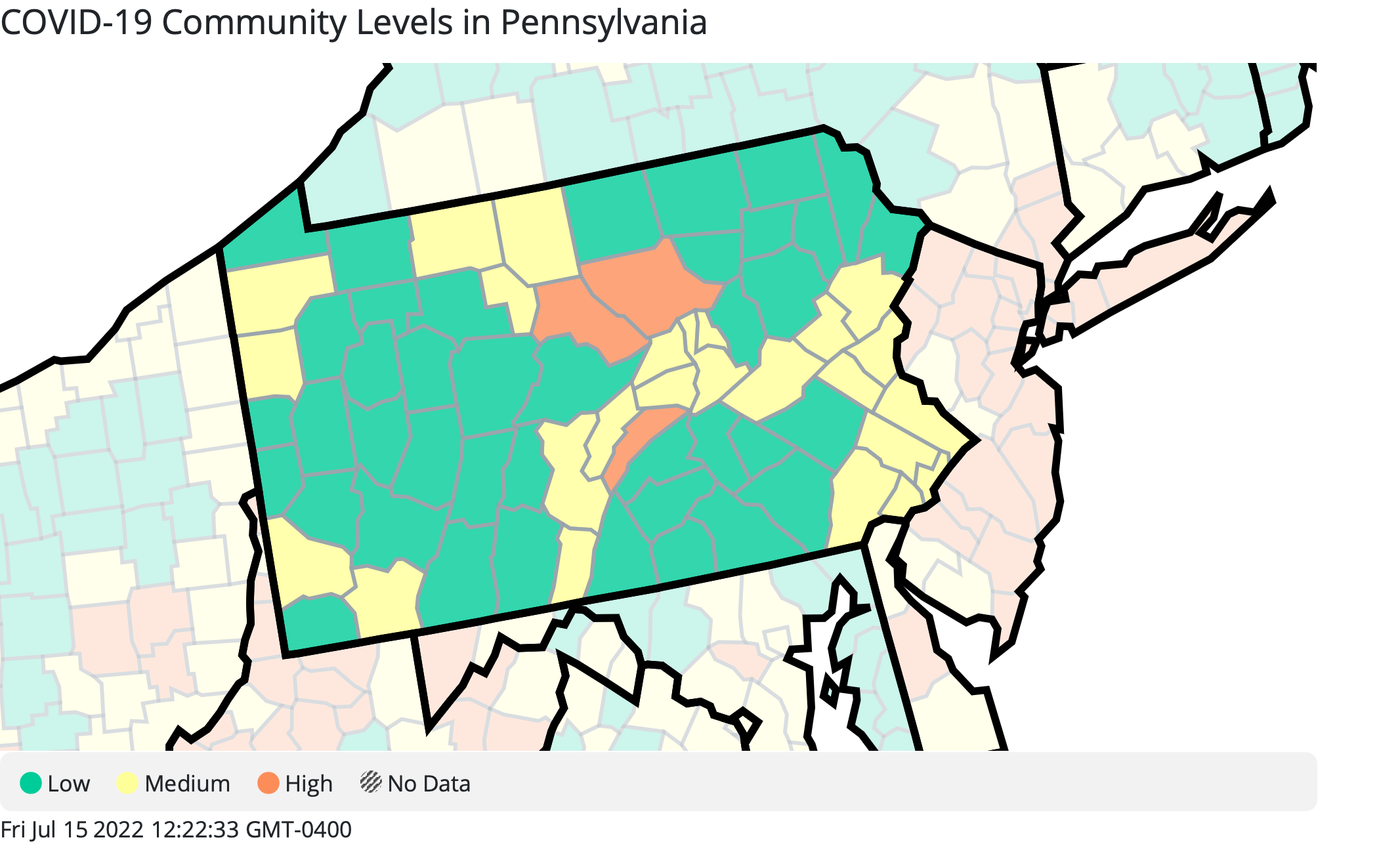 This week, Lycoming, Clinton, and Juniata counties are in the "high" community transmission category. This is a much lower number of counties than in early June, when 17 counties had "high" community levels.