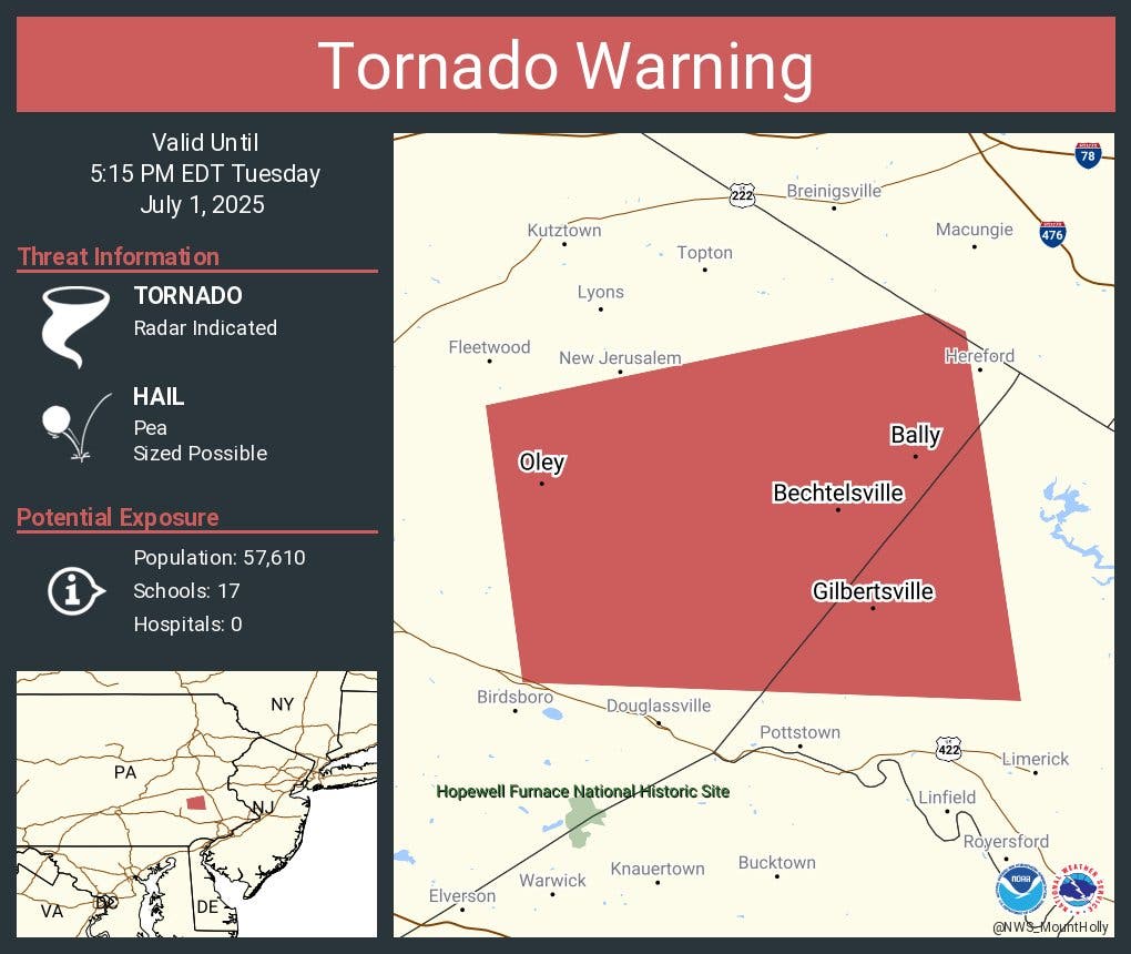 A tornado warning has been issued in parts of southeastern Pennsylvania as the powerful weather front continues moving through the region. The warning, covering parts of Montgomery and Berks counties, is in place until 5:15 p.m.