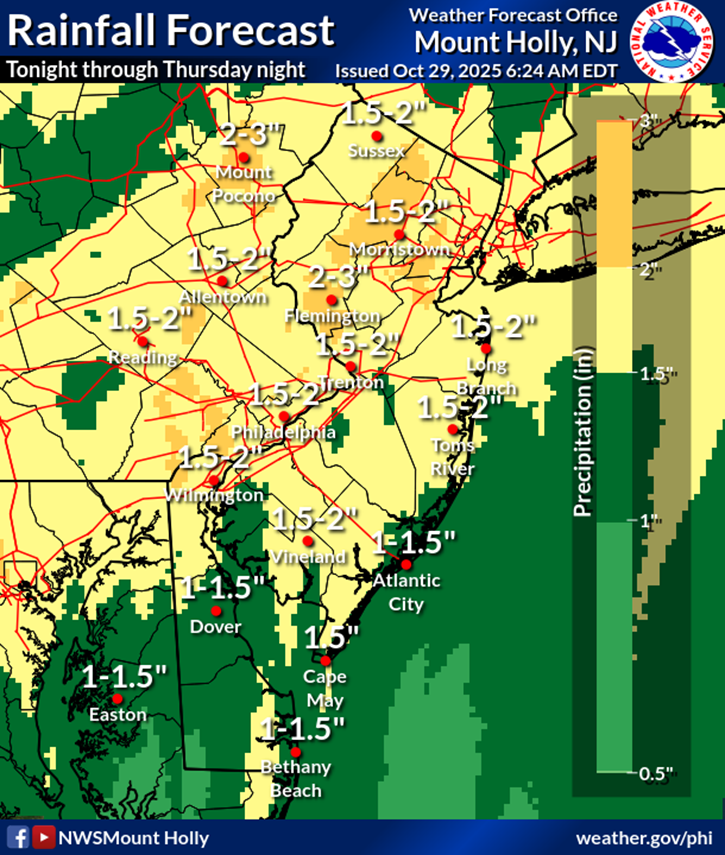 Up to two inches of rain is forecasted to fall throughout eastern Pennsylvania and southern New Jersey Thursday.
