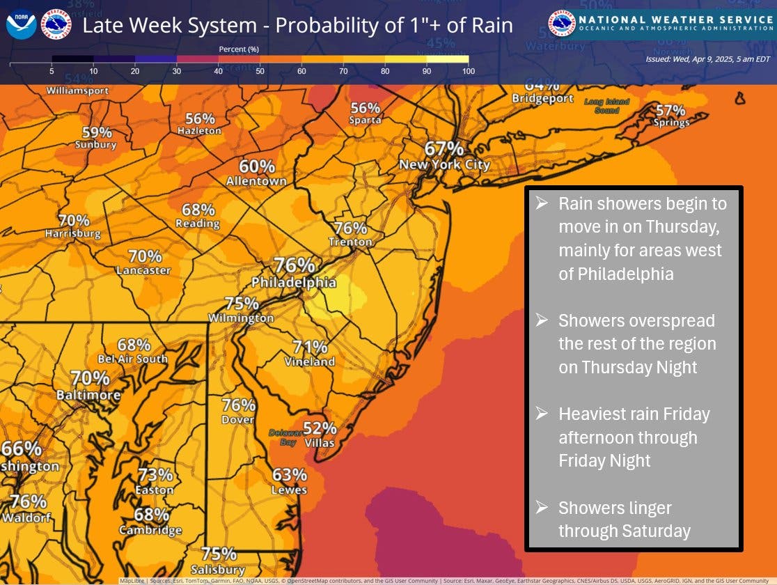Most of the Philly region has a 70 to 80 percent chance of seeing more than one inch of rain through Saturday, "though some embedded heavier rain looks likely to the point some spots may get as high or even over two inches of rain."