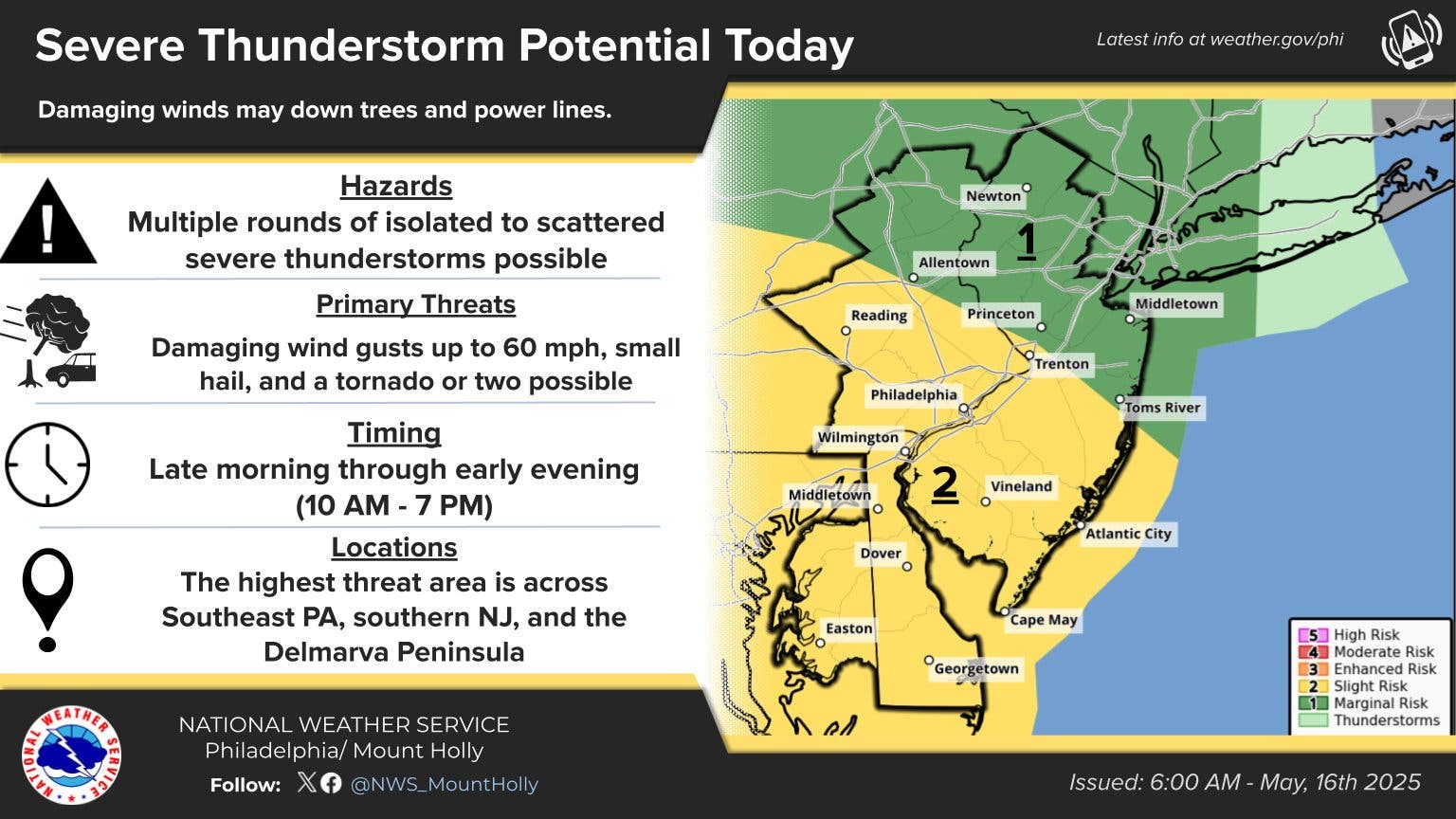 Most of the five county suburban area is within the "highest threat area," the National Weather Service said, as a band of "slight risk" stretches from just south of Allentown all the way south through the Philly area and south Jersey.