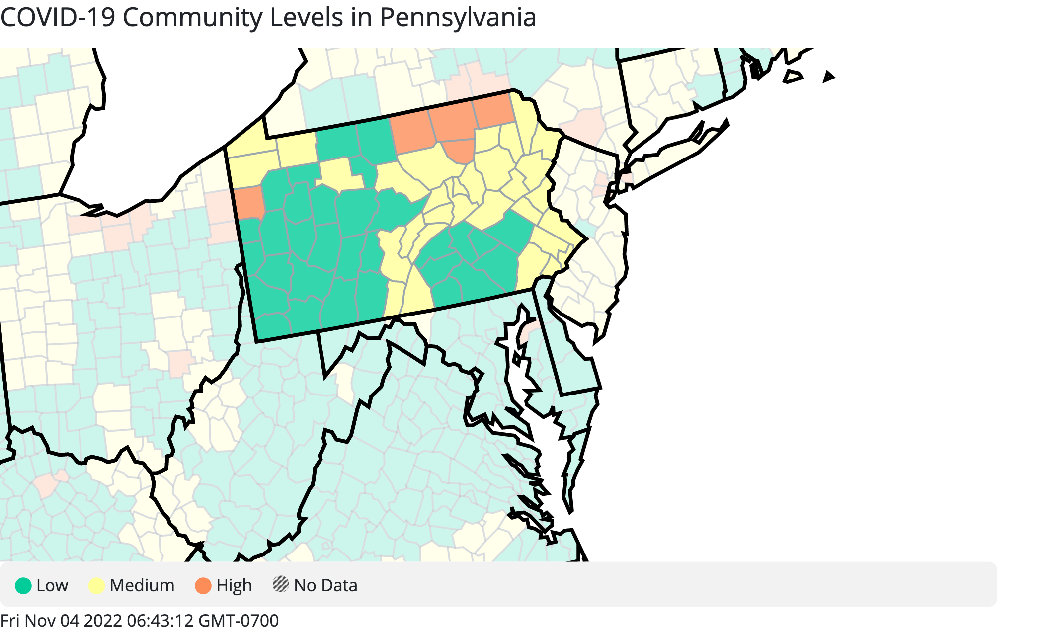Pennsylvania has just five counties "high" level of transmission, in which masks are recommended in indoor, public places. While there are consistent weekly fluctuations (last week the there were four), that number was as high was 14 in September. Tioga, Mercer, Bradford, Sullivan and Susquehanna are the "high" counties this week.