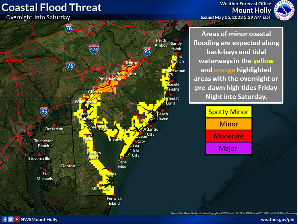 Showers are expected until early Friday evening, and there is a minor threat of coastal flooding for communities along back bays and tidal waterways on the Delaware River in southeastern Pennsylvania.
