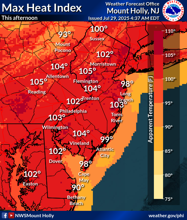 Temperatures will approach 100 degrees around the Philadelphia region Tuesday, with the heat index soaring up to 105 in some areas, forecasters said. It's more than enough to cause heat-related illness.