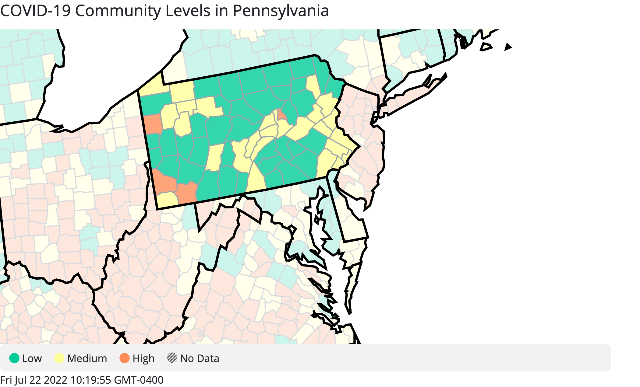 PENNSLYVANIA — As the latest wave of COVID-19 and the omicron strain BA.5 continues to wash over the East Coast this summer, masks are being recommended in certain areas. While some counties in Pennsylvania are seeing high numbers and the state's hospitalization rate is slightly climbing, the state's overall rate of cases remains largely steady.