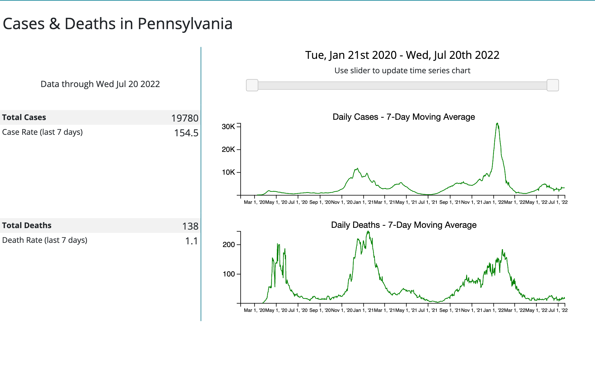 Over the past week, 138 Pennsylvanians have died from COVID. COVID death tolls are a lagging indicator — meaning that, during a COVID wave, they tend to rise only after spikes in cases and hospitalizations. But death tolls in the state have yet to increase during the BA.5 wave, according to the CDC.