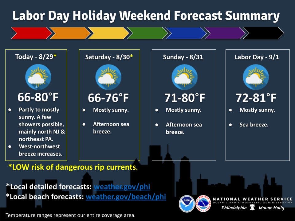 A cool front that will plummet low temperatures into the low-50s and upper-40s and bring some continued much needed relief to the greater Philadelphia area is in the forecast for the coming Labor Day weekend.