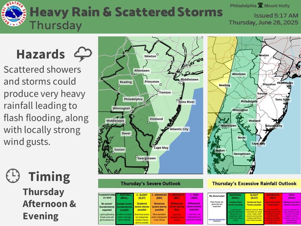 The agency categorizes most of eastern Pennsylvania as being within the "marginal" risk for excessive rainfall and severe thunder.
