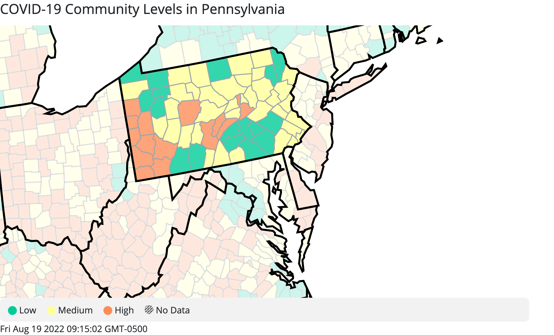 Meanwhile, all of eastern Pennsylvania and most of the rest of the state is in the "medium" level, and a growing number of counties — 19, as of Friday morning — are now in the "low" level.