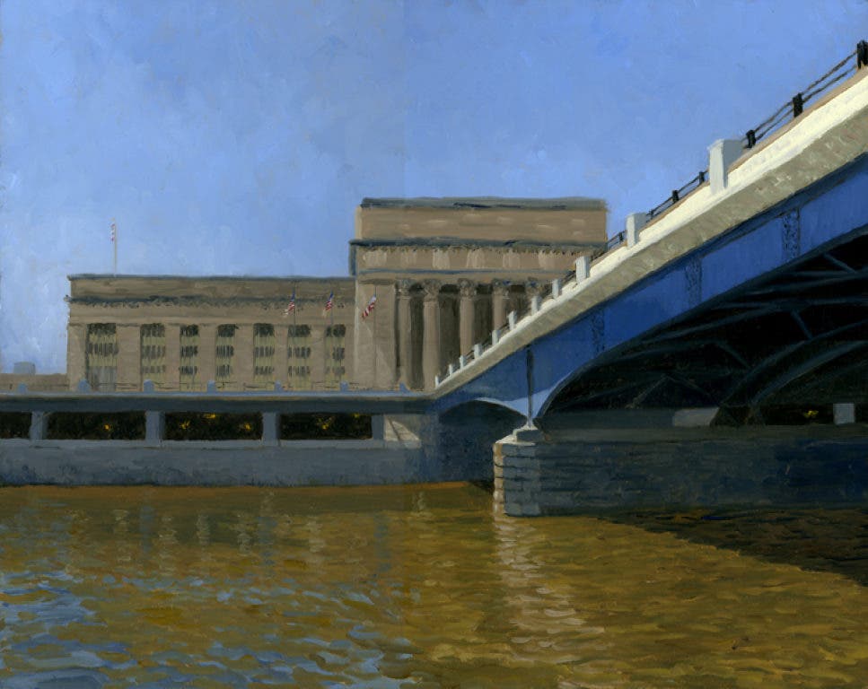This painting was created on the first two days. It is of 30th Street Station as seen from the banks of the river. It is larger than my usual painting for Postcards from Merion and it was nice to be able to use larger brushes and take more time to develop the painting. People were very friendly and everyone seemed to be enjoying the art and the sunshine on these perfect May days.