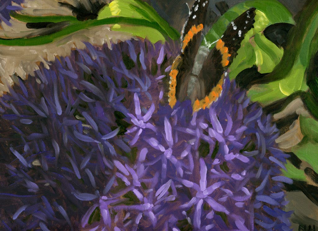 Still trying to get the hang of using more paint, I happened upon this smallish butterfly on one of my beautiful allium and couldn't help but try to capture it on canvas.