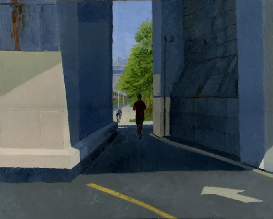 This time I wanted to catch the simple joy of being outside along a great expanse of open space that the river provides. City dwellers come from the cavern of tall buildings into the glory of this sun filled open space. Here is my version of that experience, as a runner and biker move through one of the large bridge supports onto the open path.
