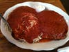 For our entrees we had a small half sausage pizza and the stuffed eggplant, with a side of spaghetti. Again, the pizza here reminded me of Chicago--the crust is thick and the sauce on top. But there are variations: The regular has a layer of cheese with sauce on top. The double adds another layer of cheese on top of the sauce, and the the triple is Marrone' version of "extra cheese."