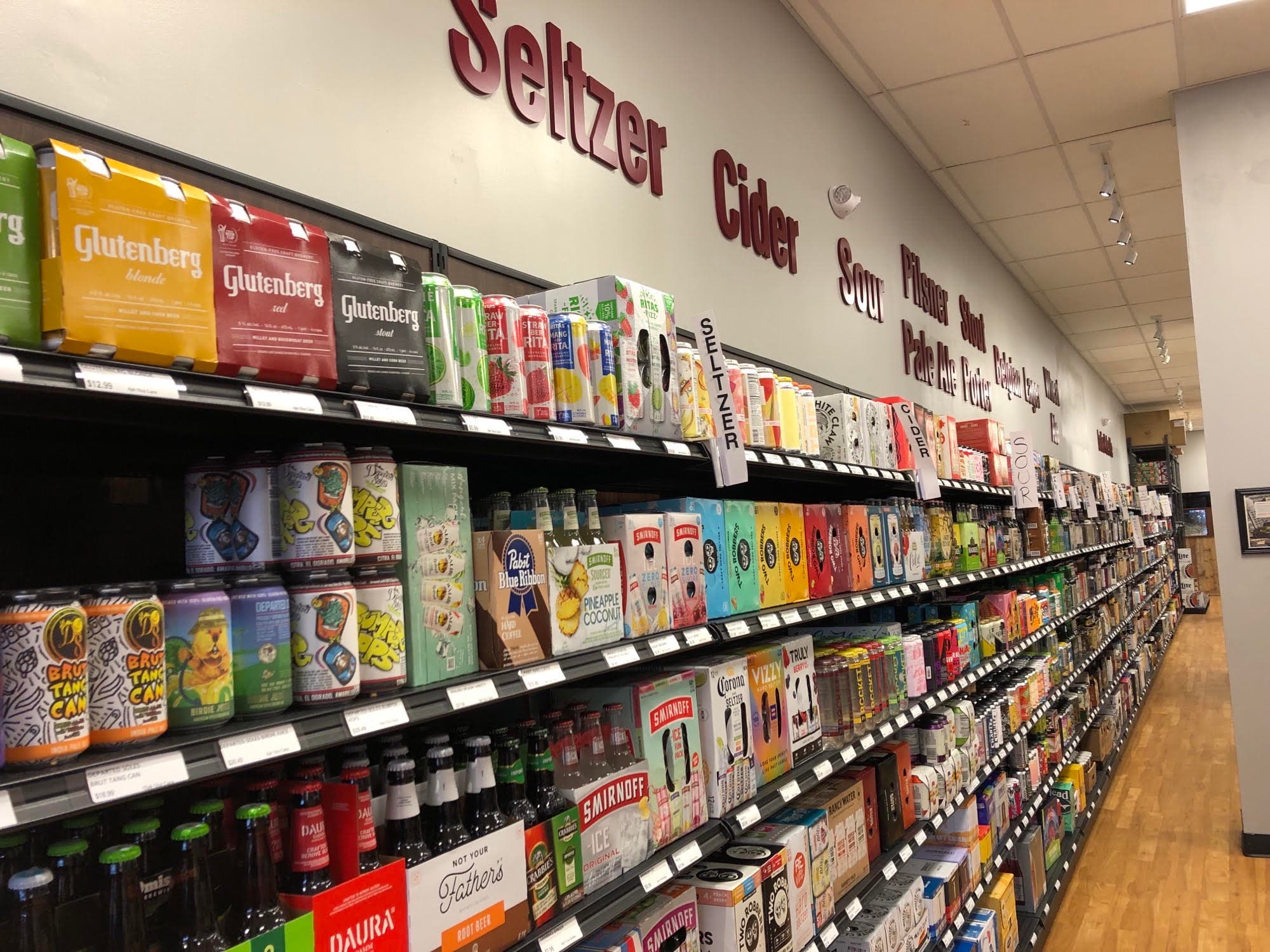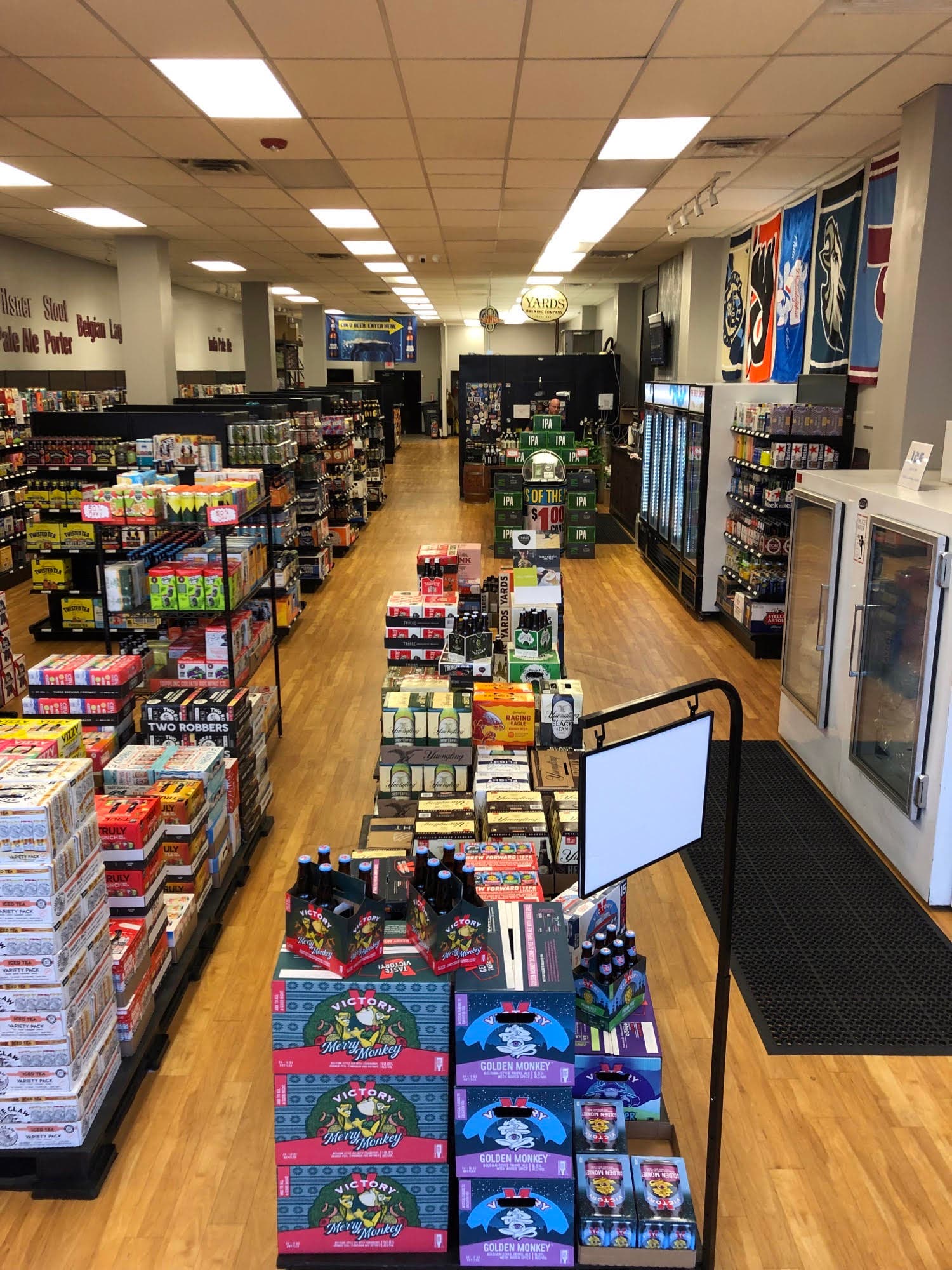 The shop has high ceilings, wide aisles, and features a huge wooden bar for samples of local and seasonal brews. The shop is decorated with local sports banners and includes a big screen TV, so customers can keep up on local sports teams while they browse or chat about the latest trends in malt beverages.