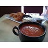 The pager buzzed, and it was off to the counter to grab our food: today's sandwich special, the Spicy Roast Beef Panini with Onion Rings ($14) and my order of a Thai Pasta Salad and a cup of the Tomato-Basil soup. There were four Soup De Jour options on the menu that day, each priced at $5.25.