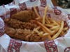 The mac and cheese looked and tasted like Kraft, which is not necessarily a bad thing. The chicken fingers were fine. Crisp on the outside, bursting with white meat and one dimensional in flavor, they were what you would expect: chicken.