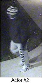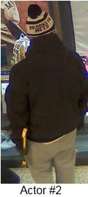 The other suspect was wearing gray sweatpants with "Jordan" on the left leg, a dark hooded jacket or sweatshirt, a Brooklyn Nets hat with a pompom on top and gray New Balance sneakers. The suspect was also wearing gloves and concealed their face.