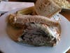 The blintzes I ordered arrived piping hot with all but one perfectly intact. The two cheese and two blueberry filled bundles were crisp on the outside and brimming with their respective fillings. Though I was given both applesauce and sour cream I stuck with the dairy condiment. I am not a fan of applesauce with my blintzes. The cheese filling was slightly sweet and wonderfully creamy. The blueberry filling was a touch tart and densely flavored. If I had to choose a favorite, I would say the cheese blintz beat out the blueberry by a nose.