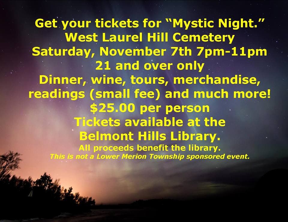 "Mystic Night" at the West Laurel Hill Cemetery! Join us on Saturday, November 7th, 7-11pm.