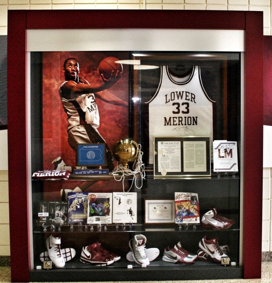 Bryant's framed high school jersey, the 1996 PIAA Boys Basketball State Championship trophy and net, and several pairs of Nike sneakers signed Bryant.