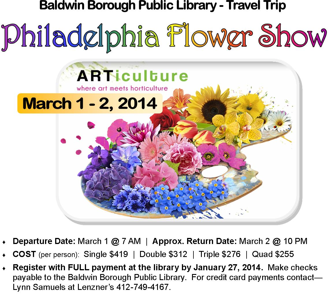 The Baldwin Library is sponsoring a weekend trip to this year's Philadelphia Flower show. Ever wanted to go, but didn't want to drive in the winter weather, or worry about parking or where to stay? We've taken care of all that for you, so sign up and come with us to explore the biggest Flower Show in the USA!