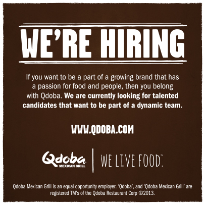 We offer flexible schedules, a great work environment, competitive pay and a great career path. If this awesome opportunity strikes your interest you should apply online today at www.qdoba.com, or stop by our restaurant to apply in person.