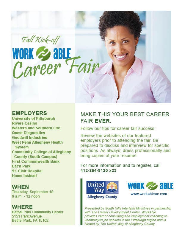 WorkAble, a United Way of Allegheny County-funded partnership of the Career Development Center of Jewish Family & Children’s Service of Pittsburgh (JF&CS), North Hills Community Outreach (NHCO) and South Hills Interfaith Ministries (SHIM), will hold a fall career fair for adults throughout the region on Thursday, September 18th, from 9 a.m. – Noon at the Bethel Park Community Center, located at 5151 Park Avenue in Bethel Park.