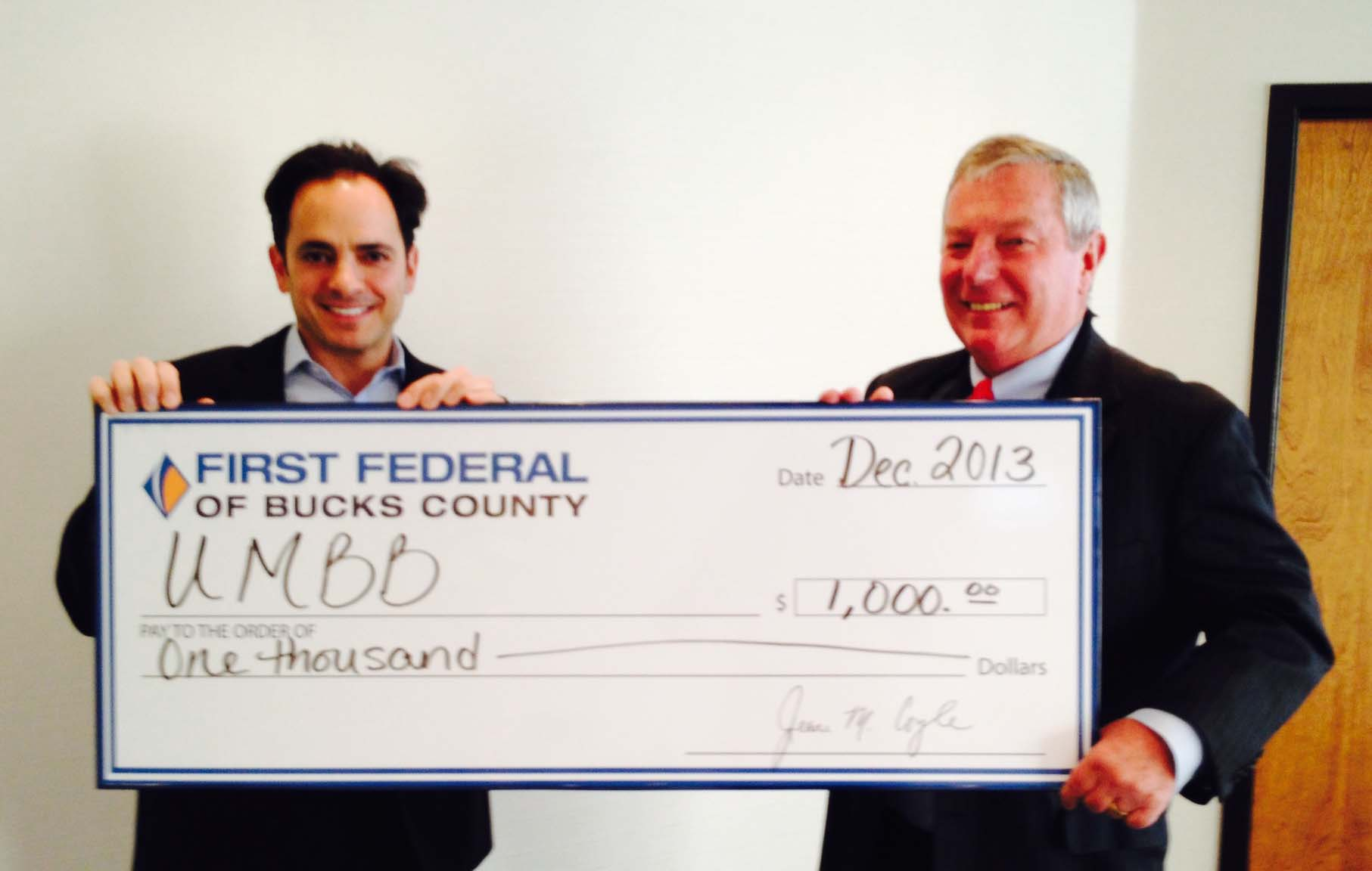 First Federal of Bucks County presented a gift of $1,000 to the UMBB Foundation this month at the request of a Board of Director member. First Federal has been a supporter of the organization and the funds will be used to support their initiative to assist needy individuals in the Delaware Valley with housing, shelter and medical assistance.